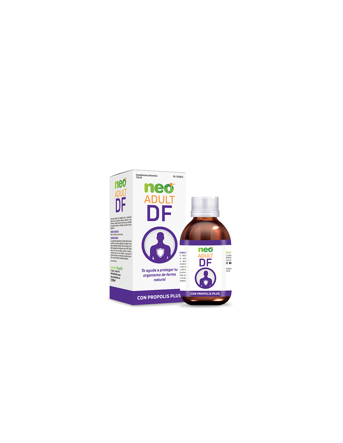 Neo Adult DF Própolis Plus es un jarabe formulado con extractos naturales de própolis, equinácea y reishi, junto con vitamina C y oligoelementos como manganeso y cobre.
