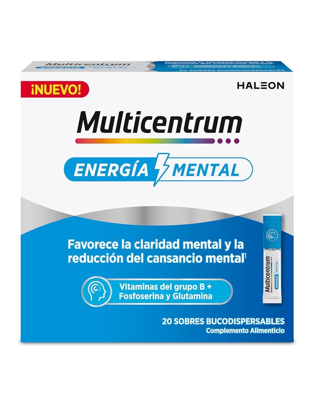Multicentrum Energía Mental es un complemento alimenticio en sobres bucodispersables diseñado para apoyar el rendimiento cognitivo y combatir la fatiga mental en situaciones de alta exigencia intelectual.