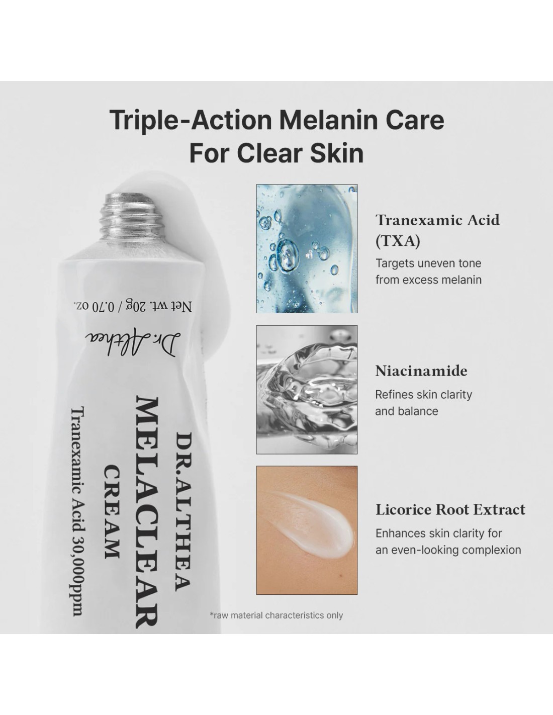 Dr. Althea Melaclear Cream es un tratamiento específico para la hiperpigmentación diseñado para actuar sobre manchas oscuras, marcas de acné y tono desigual. Su innovadora textura tipo ungüento se funde en contacto con la piel, transformándose en una crema ligera con acabado tipo sérum que permite una rápida absorción sin sensación pesada.