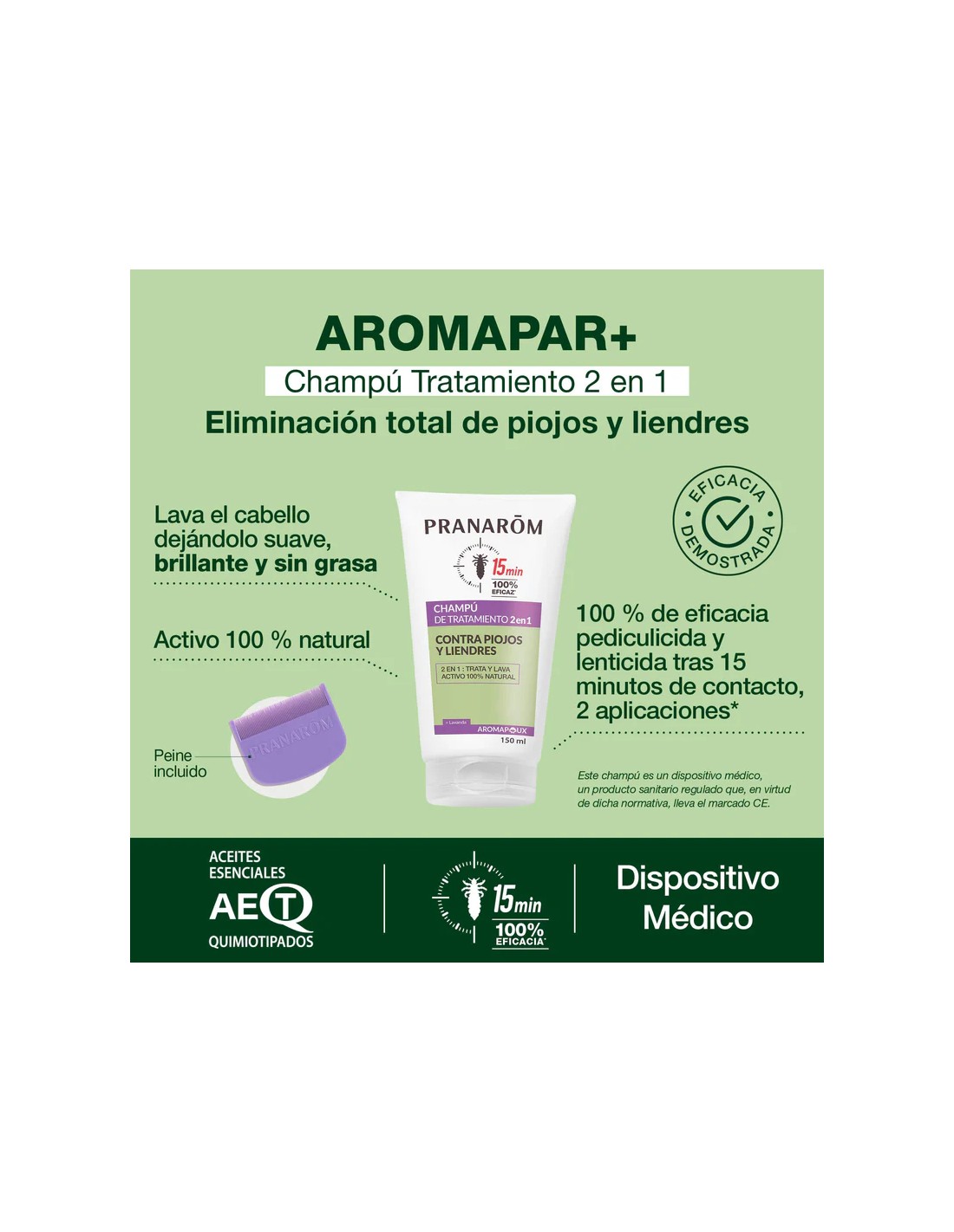 - Elimina piojos y liendres en aproximadamente 15 minutos