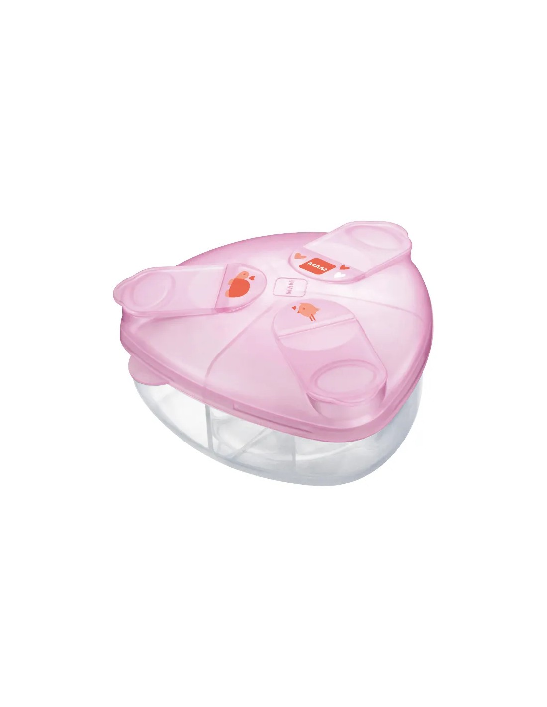 Dispensador de leche en polvo con diseño triangular innovador que permite verter fácilmente el contenido en el biberón sin residuos. Su estructura optimizada facilita el llenado completo y la dosificación precisa, siendo ideal para el día a día y los paseos.