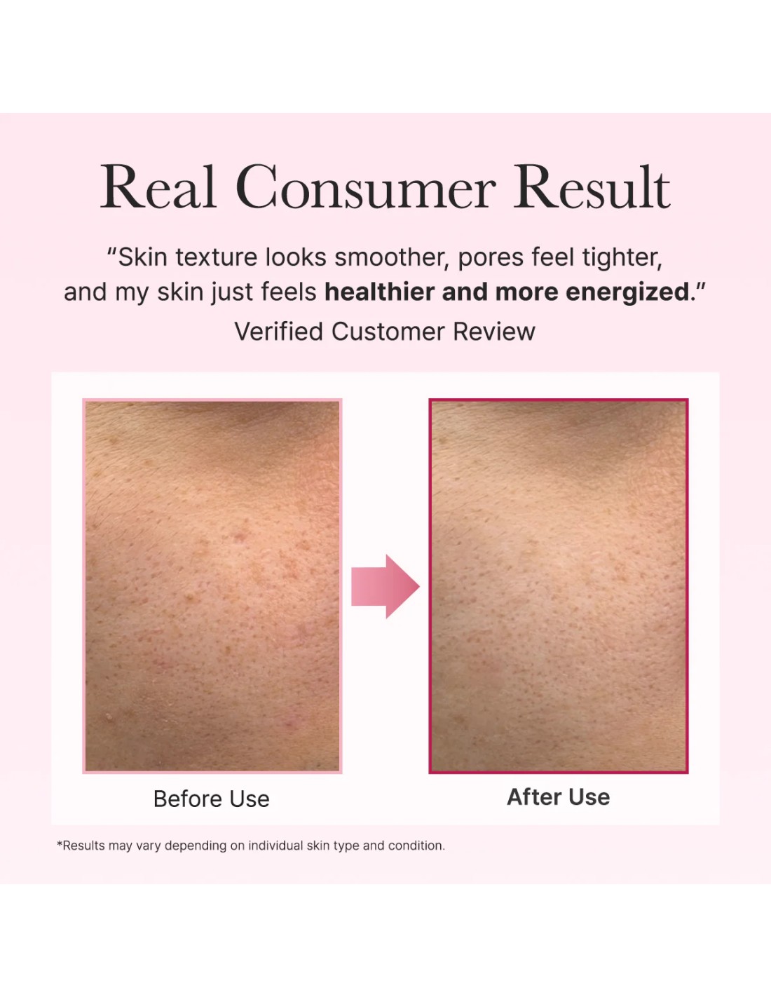 La fórmula se completa con péptidos biomiméticos, que contribuyen a mejorar la firmeza y elasticidad cutánea, junto con niacinamida, que ayuda a unificar el tono y aportar luminosidad, y pantenol, que refuerza la barrera cutánea y mejora el confort de la piel. Esta combinación de activos permite actuar de forma global sobre los signos de fatiga, la pérdida de elasticidad y las irregularidades del tono.