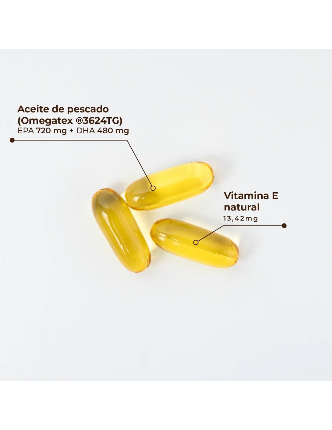 Aceite de PESCADO 3624TG [65% omega 3, 36% ácido eicosapentaenoico (EPA), 24% ácido docosahexaenoico (DHA)], gelatina bovina, humectante (sorbitol, glicerina), D-alfa tocoferol (vitamina E ), agua.