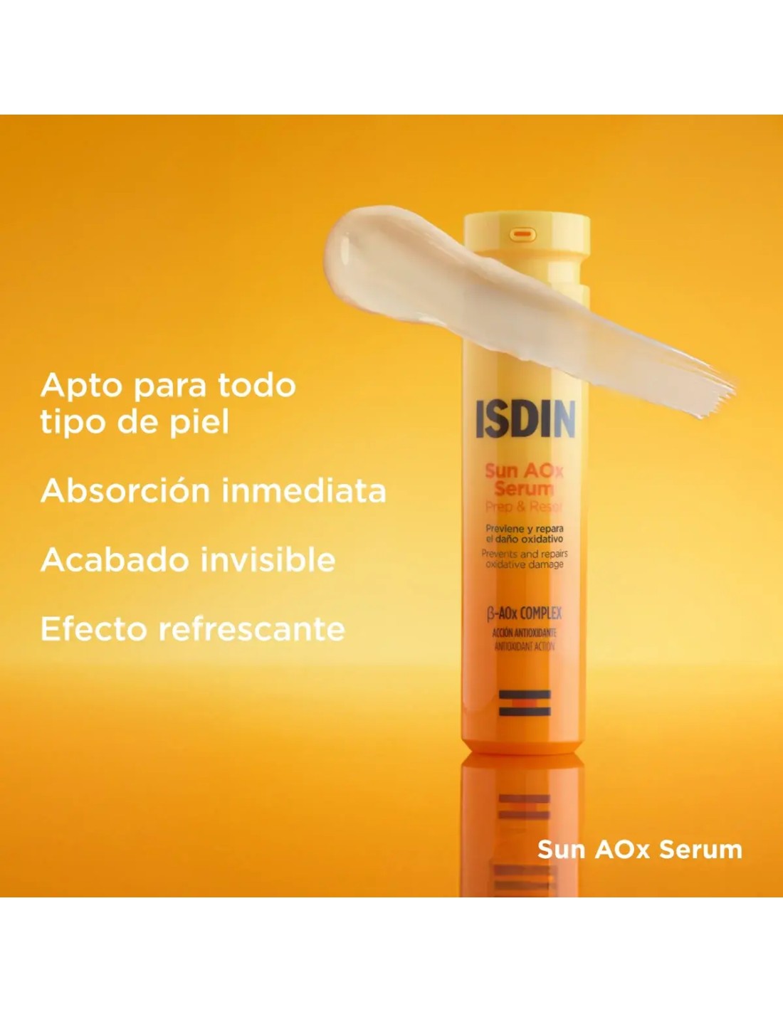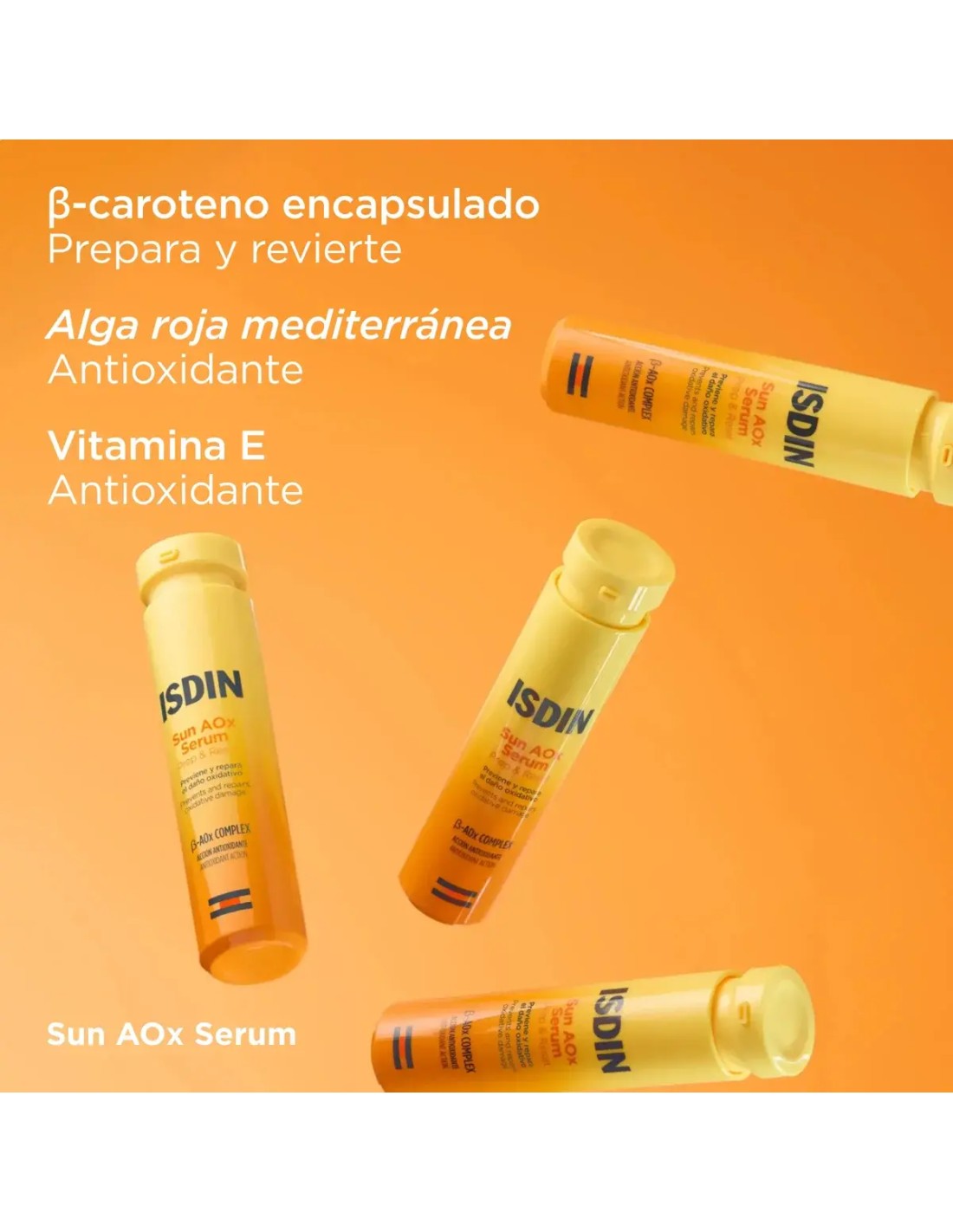 Isdin Sun AOx Serum es un sérum facial con acción antioxidante avanzada que actúa tanto antes como después de la exposición solar, ayudando a proteger la piel frente al estrés oxidativo y a reparar los daños inducidos por la radiación UV.