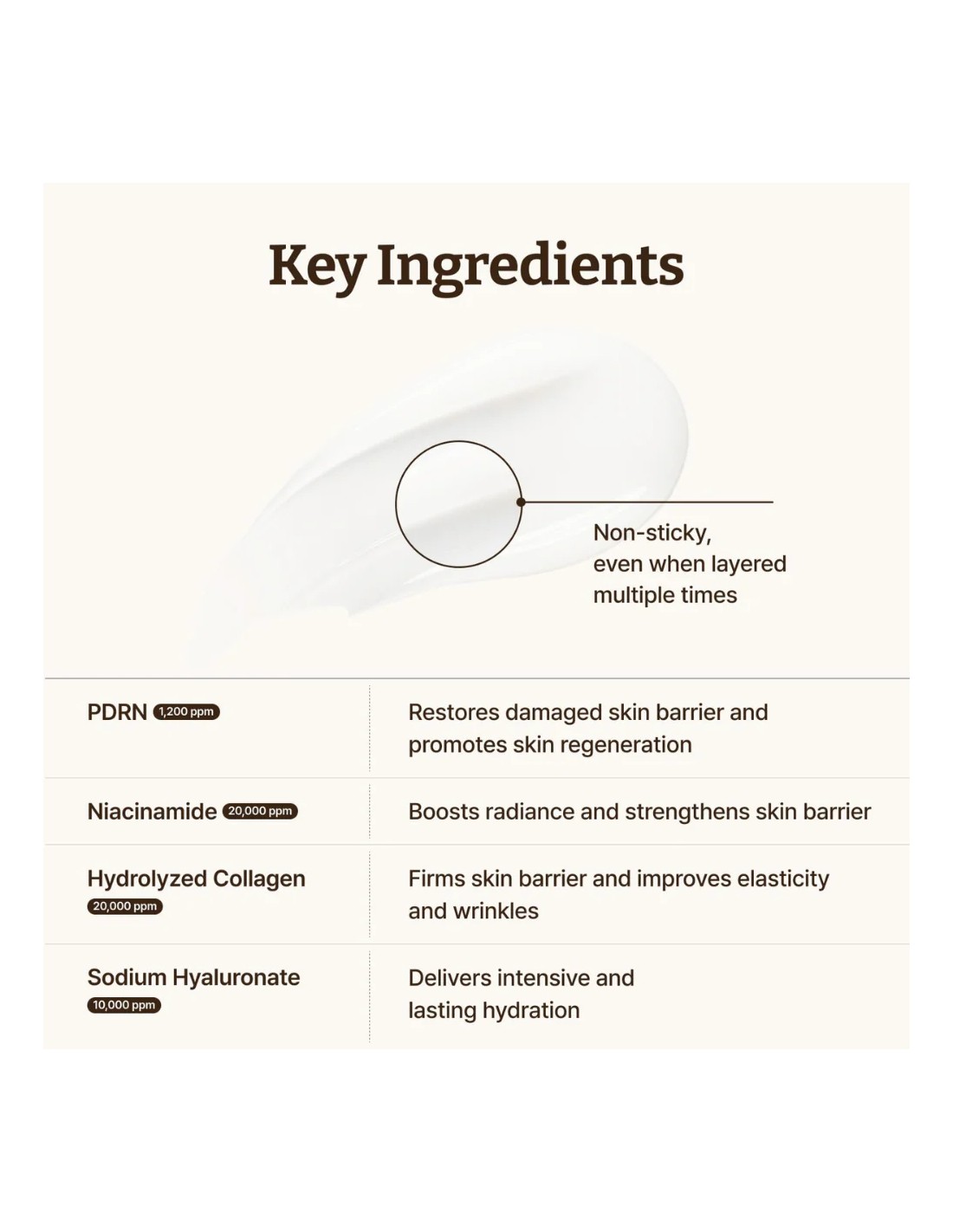 Water (Aqua), Glycerin, Dimethicone, Butylene Glycol, Niacinamide, Panthenol, Pentylene Glycol, 1,2-Hexanediol, Caprylyl Methicone, Sodium Hyaluronate, Hydrolyzed Collagen, Hydrolyzed Hyaluronic Acid, Cetearyl Olivate, Acrylates/C10-30 Alkyl Acrylate Crosspolymer, Aminomethyl Propanediol, Hydroxyethyl Acrylate/Sodium Acryloyldimethyl Taurate Copolymer, Sorbitan Olivate, Sodium Acrylate/Sodium Acryloyldimethyl Taurate Copolymer, Sodium DNA, Isohexadecane, Ethylhexylglycerin, Adenosine, Polysorbate 80, Sodium Phytate, Sorbitan Oleate, Tocopherol, Allantoin, Ammonium Acryloyldimethyl Taurate/VP Copolymer, Betaine.