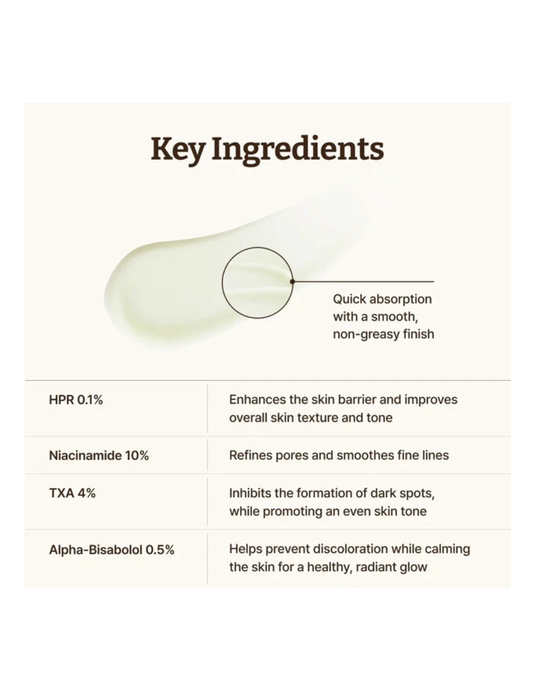 Water, Butylene Glycol, Niacinamide, Squalane, Tranexamic Acid, Methyl Trimethicone, Pentylene Glycol, Glycerin, Hydrogenated Ethylhexyl Olivate, Betaine, Propanediol, Dimethyl Isosorbide, C14-22 Alcohols, Bisabolol, Panthenol, Tocopheryl Acetate, 4-t-Butylcyclohexanol, Chondrus Crispus Extract, Hydroxyethyl Acrylate/Sodium Acryloyldimethyl Taurate Copolymer, Glyceryl Stearate, PEG-100 Stearate, Hydrogenated Olive Oil Unsaponifiables, Saccharum Officinarum (Sugarcane) Extract, C12-20 Alkyl Glucoside, 1,2-Hexanediol, Carbomer, Hydroxypinacolone Retinoate, Tromethamine, Ethylhexylglycerin, Xanthan Gum, Adenosine, Palmitic Acid, Stearic Acid, Sorbitan Isostearate, Sodium Hyaluronate, Paeonia Suffruticosa Root Extract, Beta-Glucan, Tocopherol.