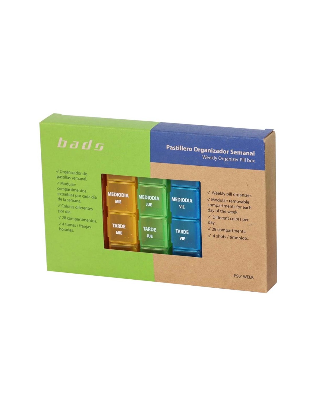 El pastillero semanal PS01WEEK es una solución cómoda y eficaz para organizar la medicación de toda la semana. Cuenta con un sistema modular formado por 7 módulos independientes (uno por día), cada uno con 4 compartimentos diferenciados para cubrir las distintas franjas horarias del día (mañana, mediodía, tarde y noche).